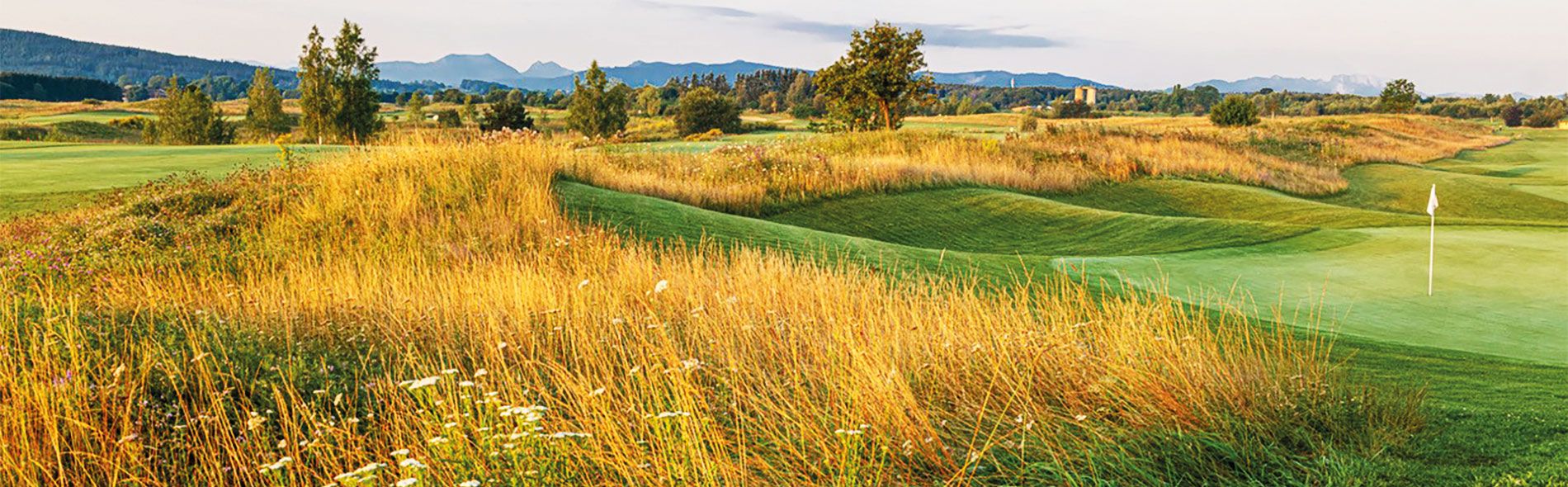 Der Alpen Links Course ist von klassischen Links-Plätzen inspiriert und fügt sich harmonisch in die Landschaft ein – mit Blick auf die Tegernseer Alpen. Die Anlage verfügt über fünf Seen und ist wasserautark, da die Bewässerung vollständig